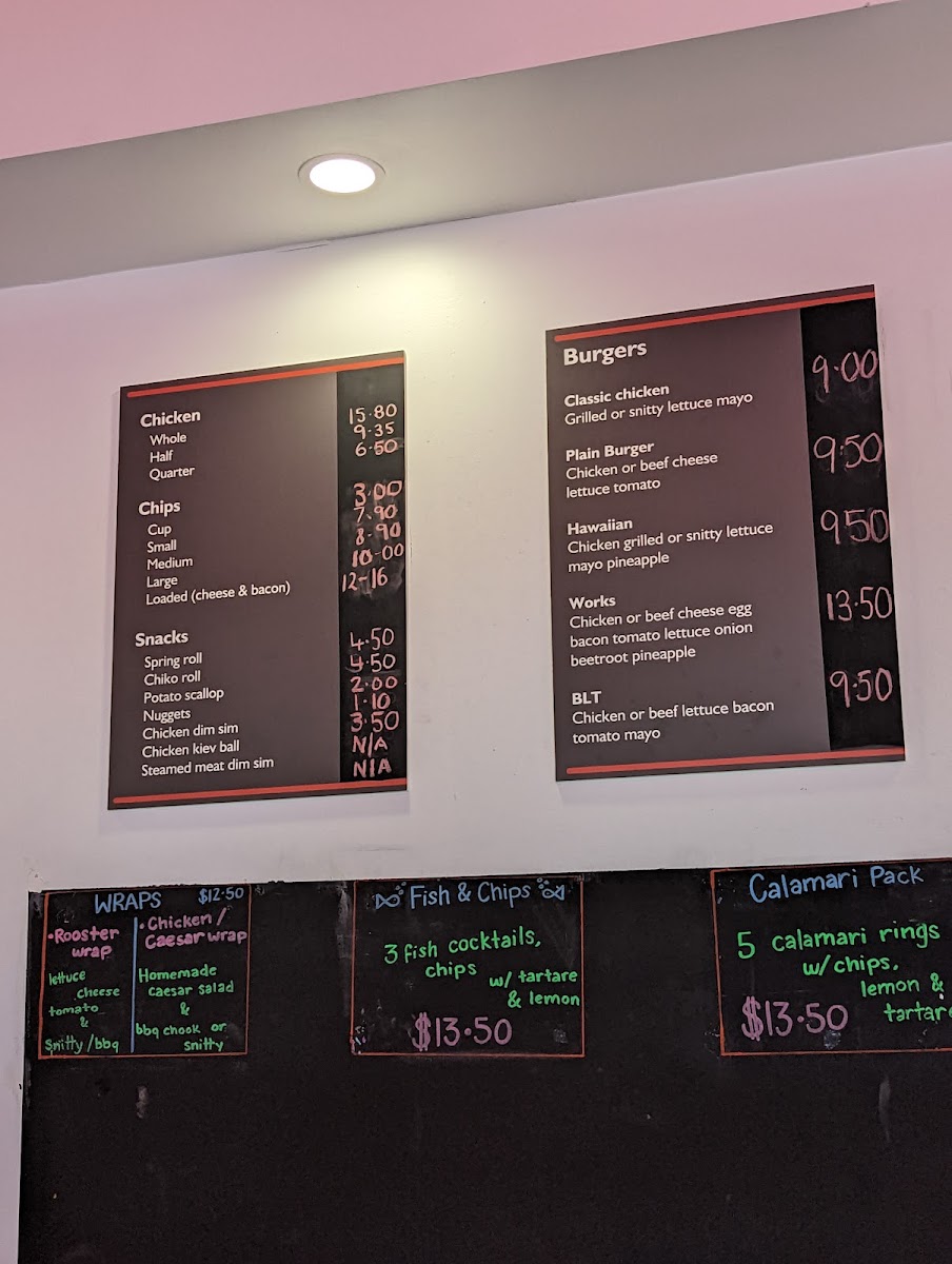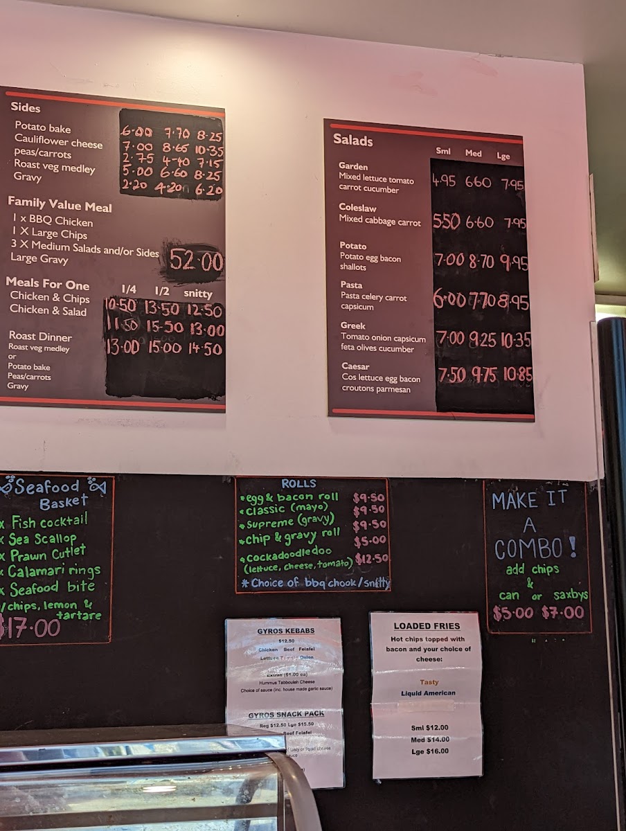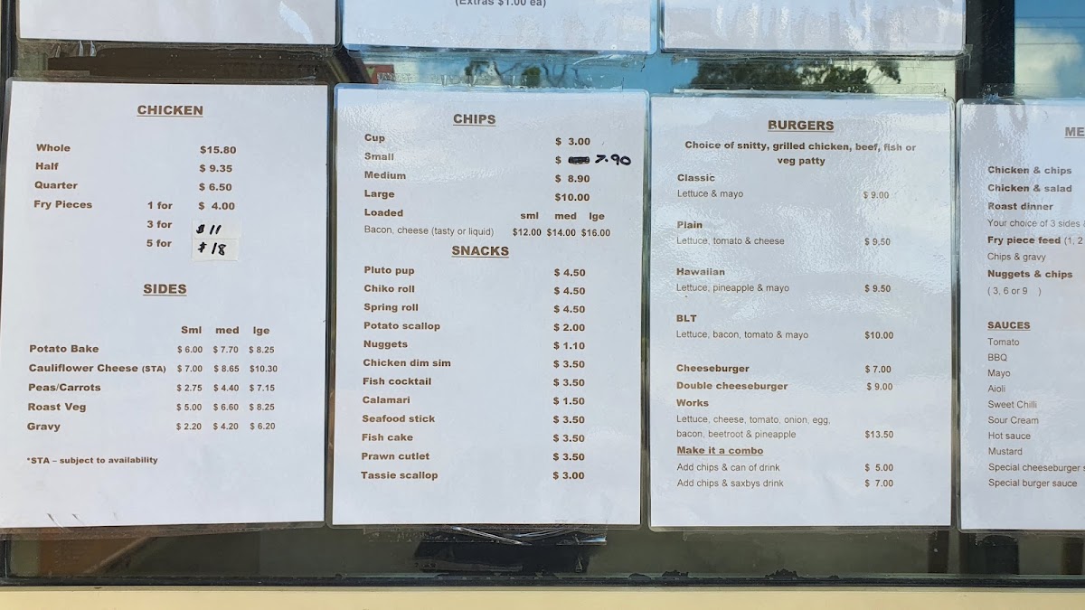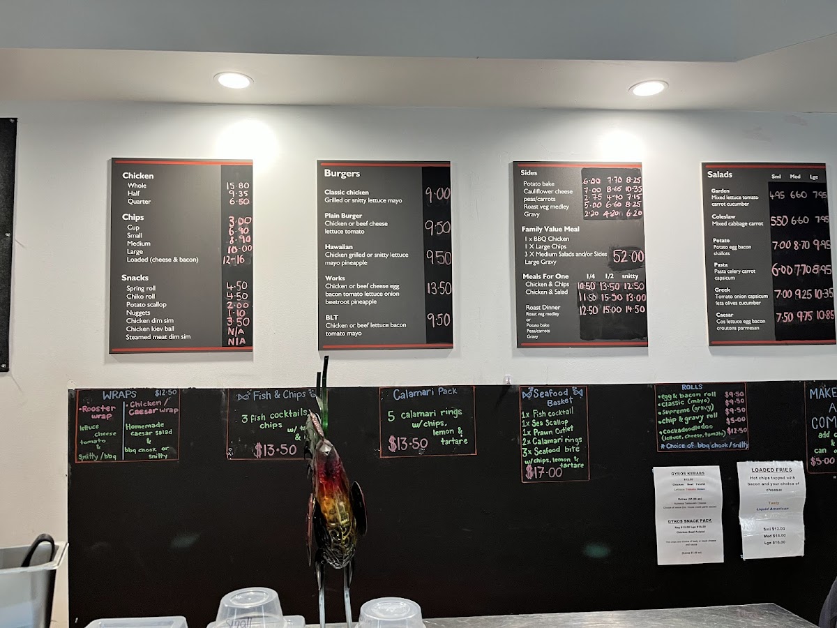 - Snacks: A range of light bite items like Calamari, Seafood Stick, Pluto Pup, Chiko Roll, Spring Roll, Potato Scallop, Nuggets, Chicken Dim Sim, Fish Cocktail, Fish Cake, Prawn Cutlet, and Tassie Scallop, suitable for quick snacks or additions to a main meal.